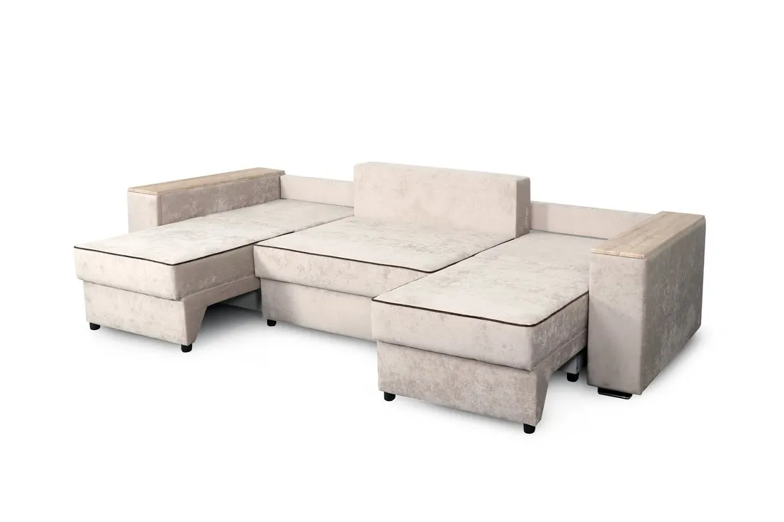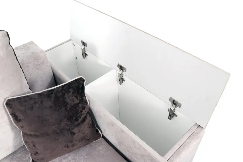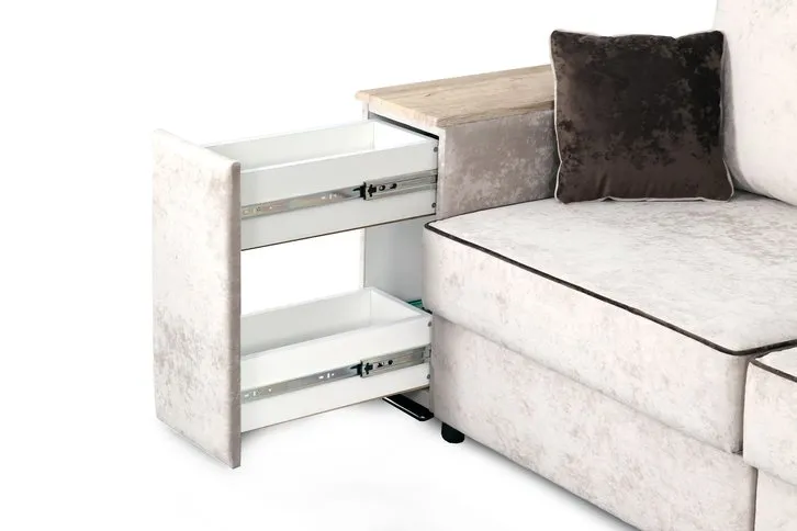 С одной стороны расположена боковина с нишей, с другой – ящики. Надежные петли с доводчиками добавляют комфортности использования мебели. Диван-трансформер может быть прямым, угловым и П-образным. Малые декоративные подушки входят в комплект дивана.