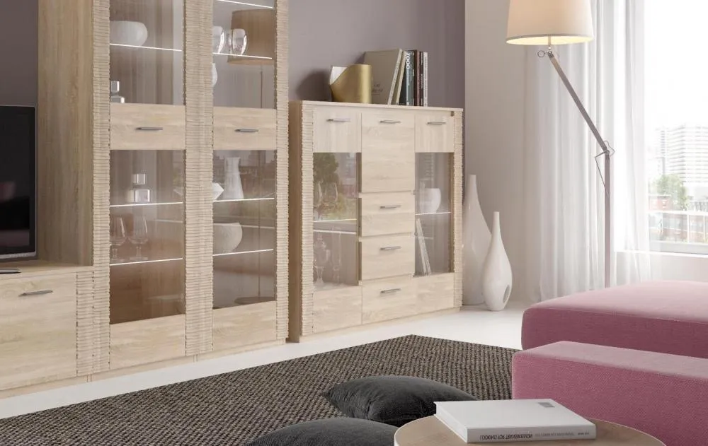 По центру комода располагаются три ящика на роликовых направляющих, над которыми имеется отделение бара закрытое глухой дверцей. Боковые отделения закрыты распашными дверцами со стеклом. Каждое из отделений оснащено двумя стационарными полками и съёмной стеклянной полкой, на которую можно установить светильник.