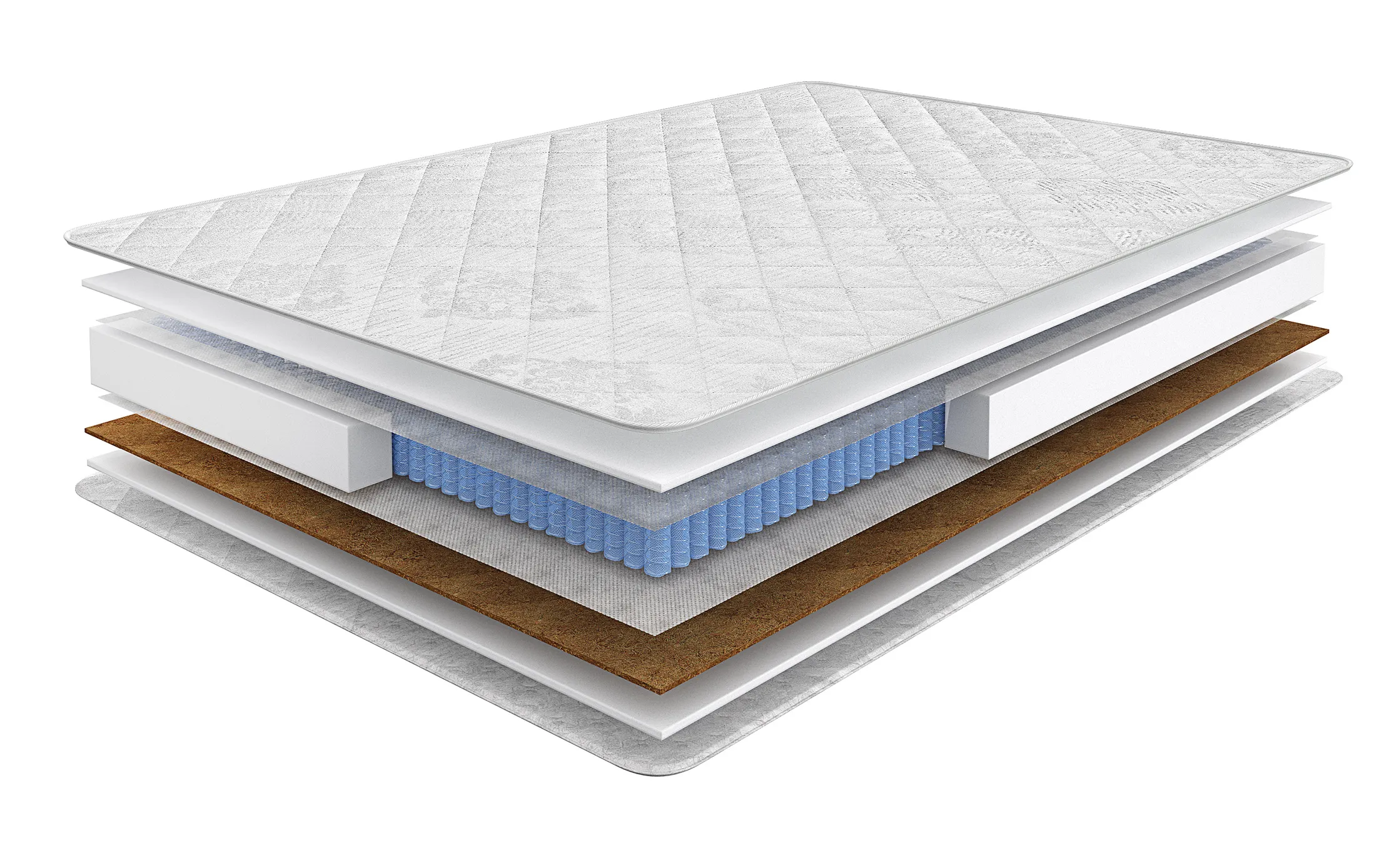 В составе комфортного слоя – натуральные и искусственные материалы. Одна сторона матраса комфортной средней жесткости за счет сочетания латексированной кокосовой койры и ортопены. Другая – более мягкая, так как содержит одну ортопену. Подобное сочетание наполнителей гарантирует идеальный микроклимат спального места за счет хорошей вентилируемости.