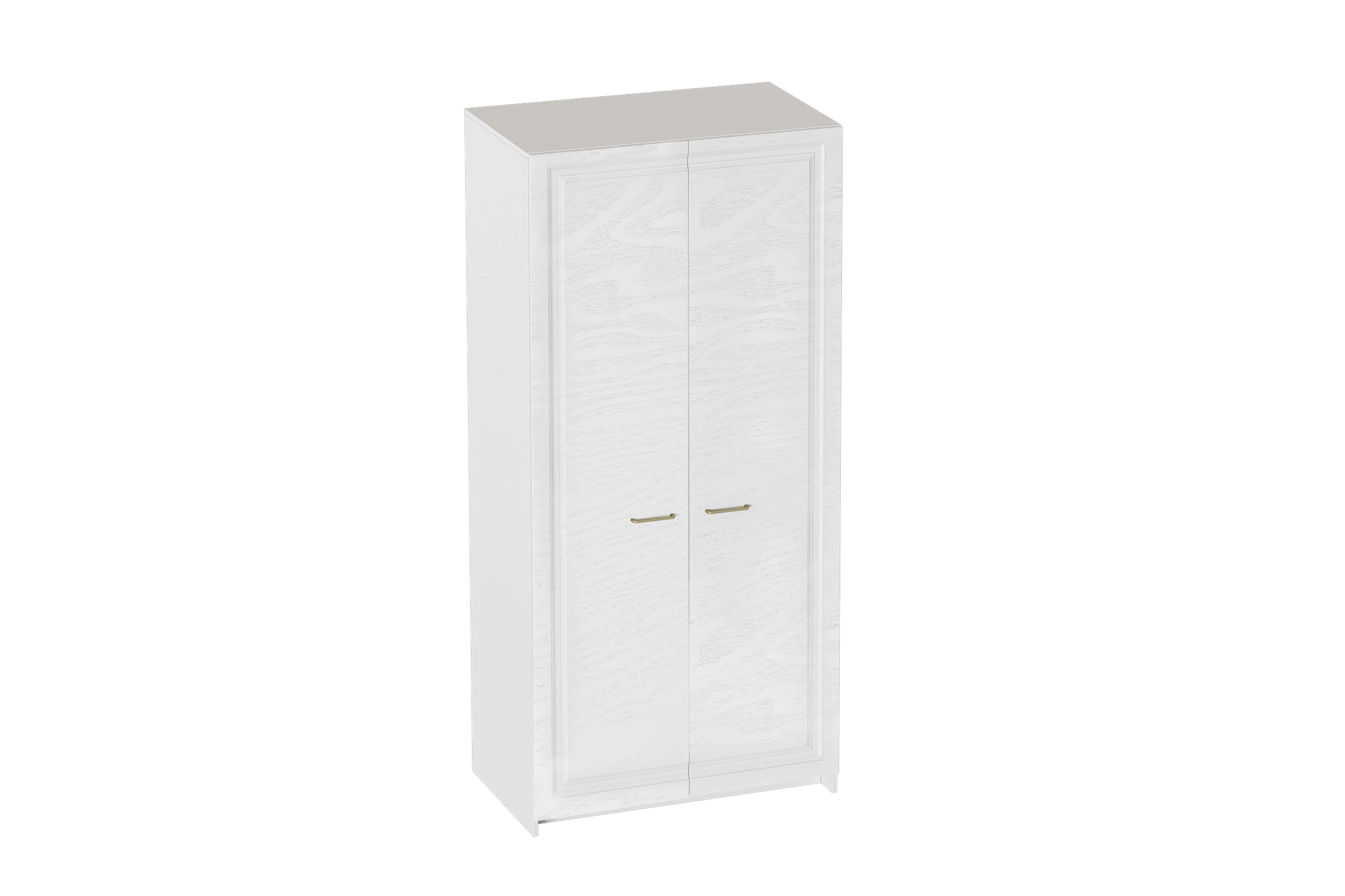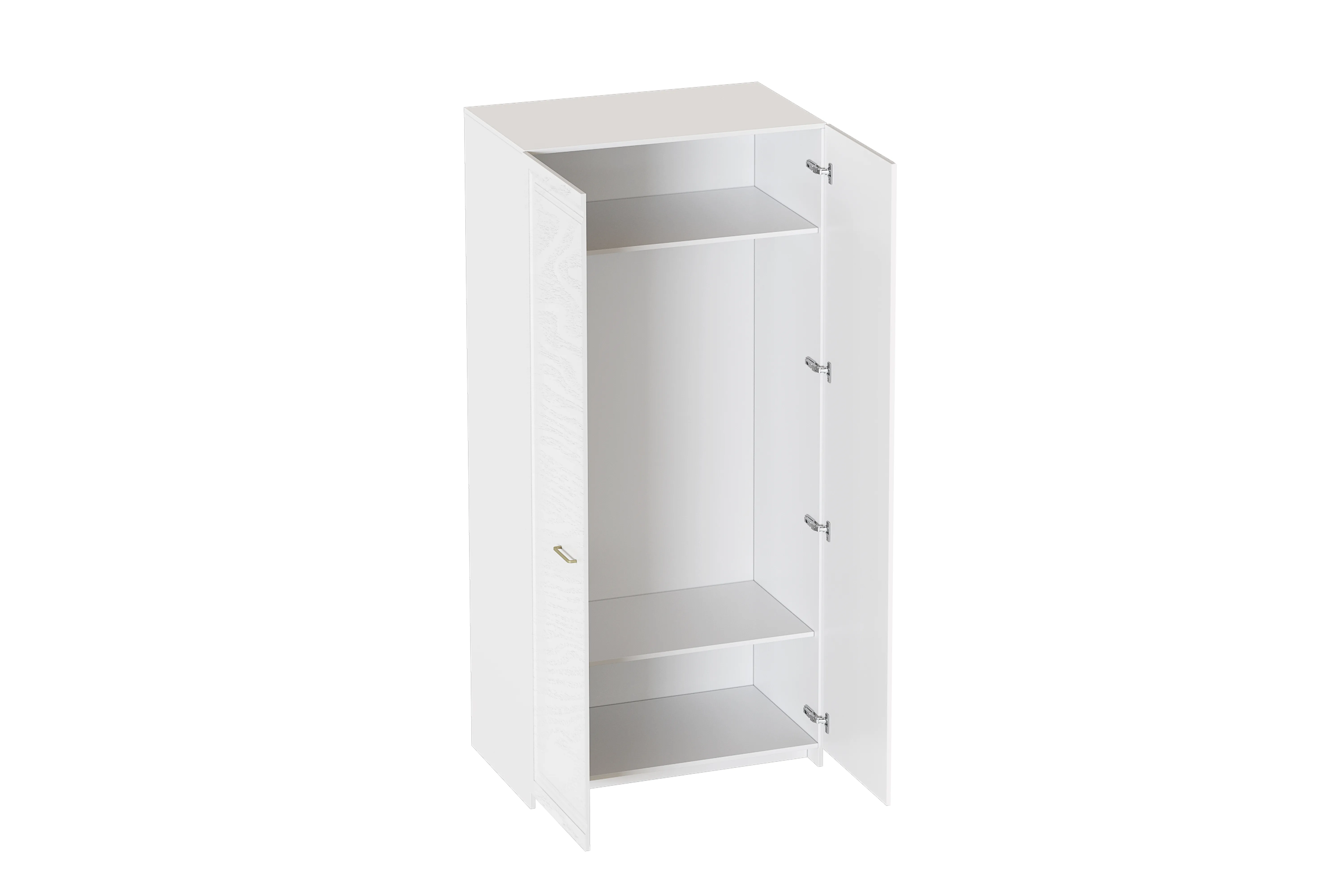 Шкаф выполнен в цвете Айс 06 / Белый Аляска. Классическая фрезеровка фасадов и ручки-скобы из брашированного золота придают изделию особый шарм и элегантность. Внутреннее пространство шкафа разделено натри секции. Верхняя секция шкафа отделена жёсткой полкой. В средней секции под жёсткой полкой расположена овальная штанга. Нижняя секция отделена от средней съемной полкой. Двери оснащены петлями с амортизаторами.