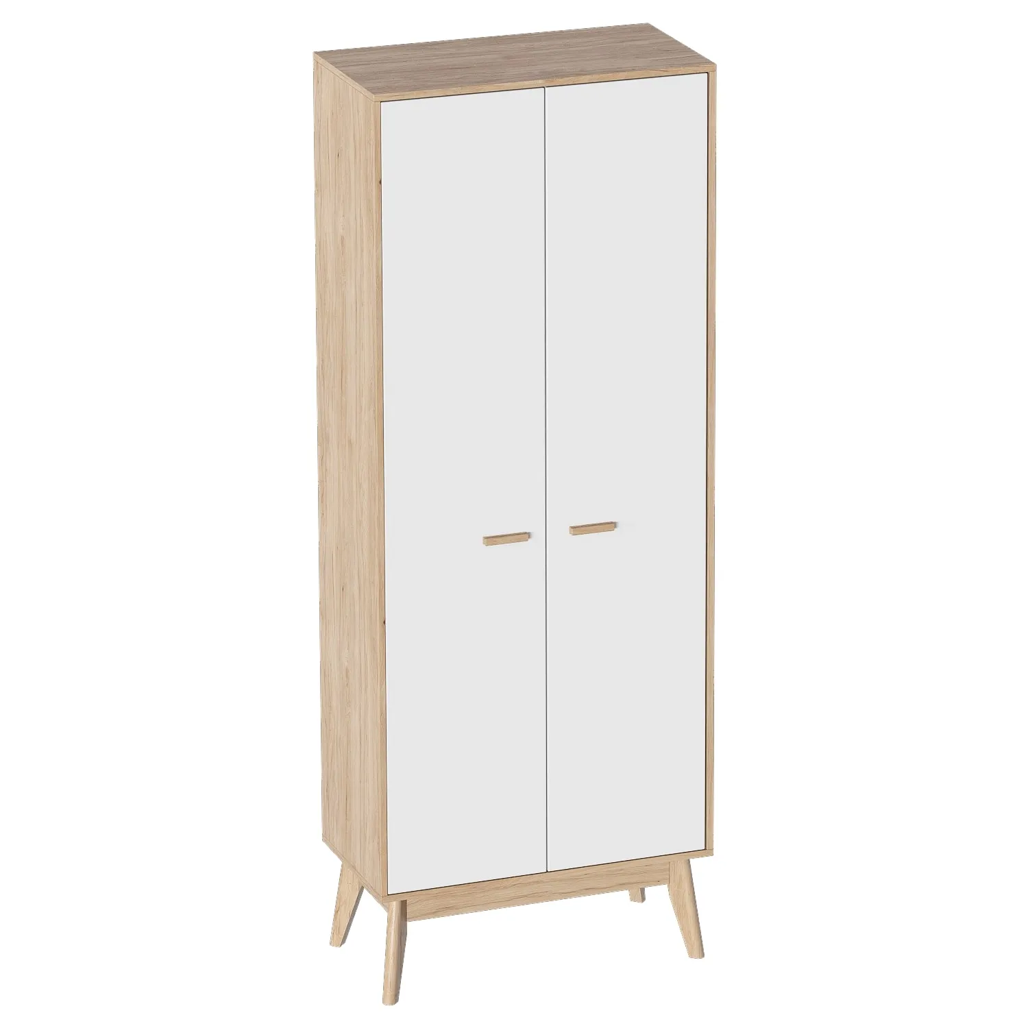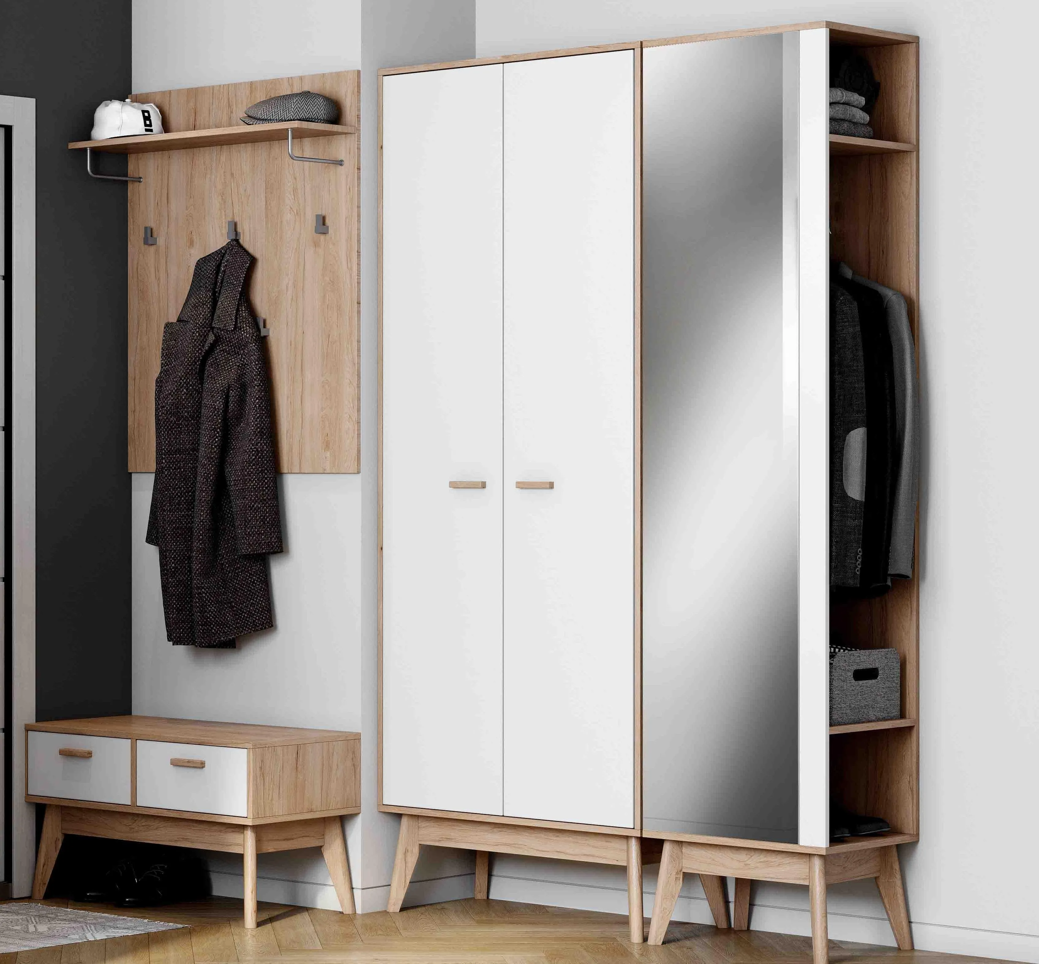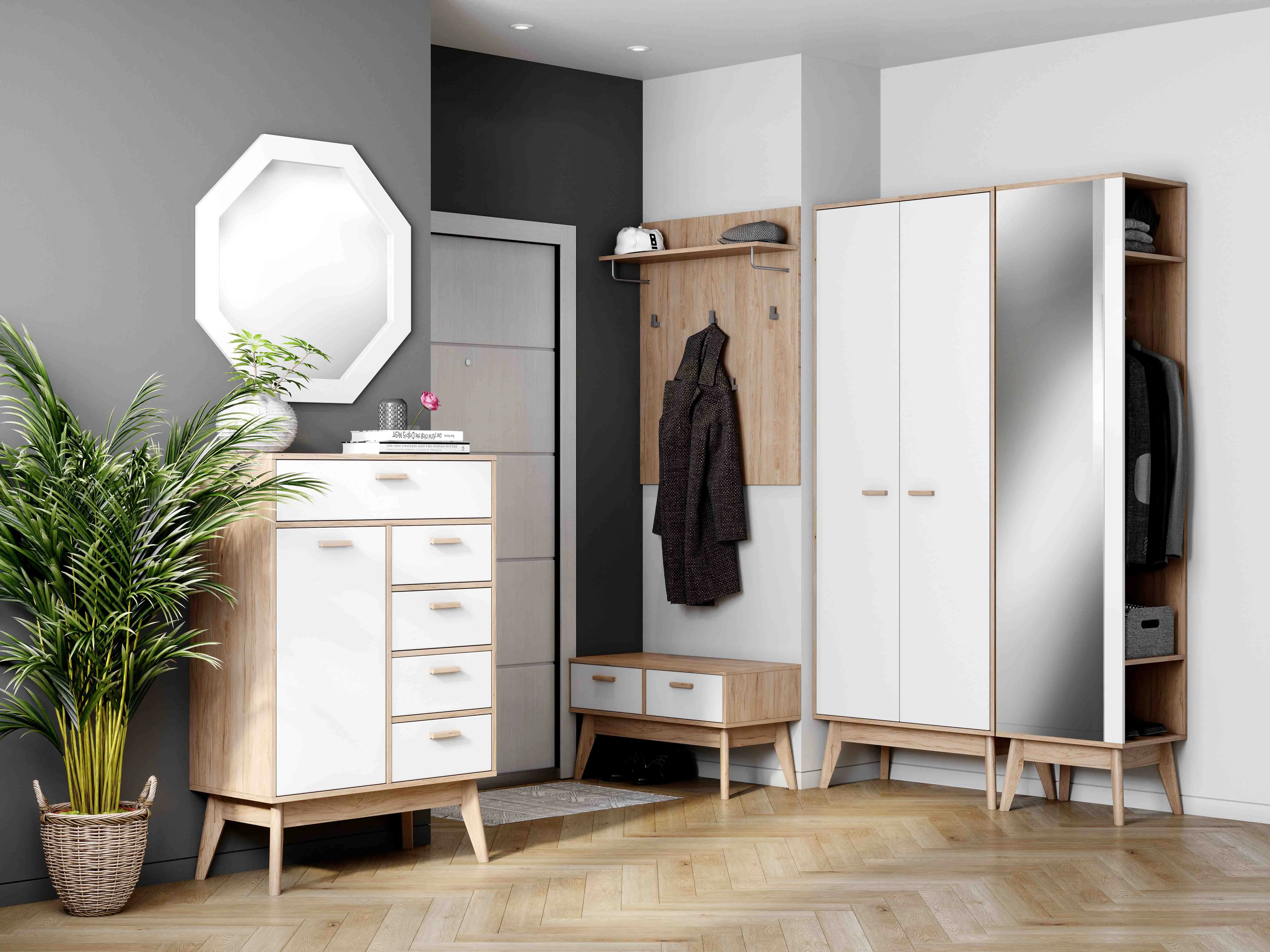 Ручки шкафа выполнены из массива березы, как и опоры. Несмотря на свои габариты и функциональность, шкаф выглядит очень легким и нарядным, высокие опоры обеспечивают пространство под шкафом, удобное как для легкой уборки, так и для дополнительного хранения вещей в стильных коробках. Отлично сочетается с комодами и тумбами "Калгари" для прихожей.