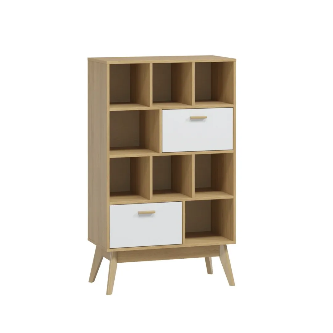 Корпус стеллажа выполнен из ЛДСП цвета натурального дерева, высокие стильные опоры и ручки - из массива березы. Стеллаж прекрасно сочетается с шкафом-витриной Калгари и ТВ тумбой. Прекрасно будет смотреться как в гостиной, так и в детской комнате или спальне.
