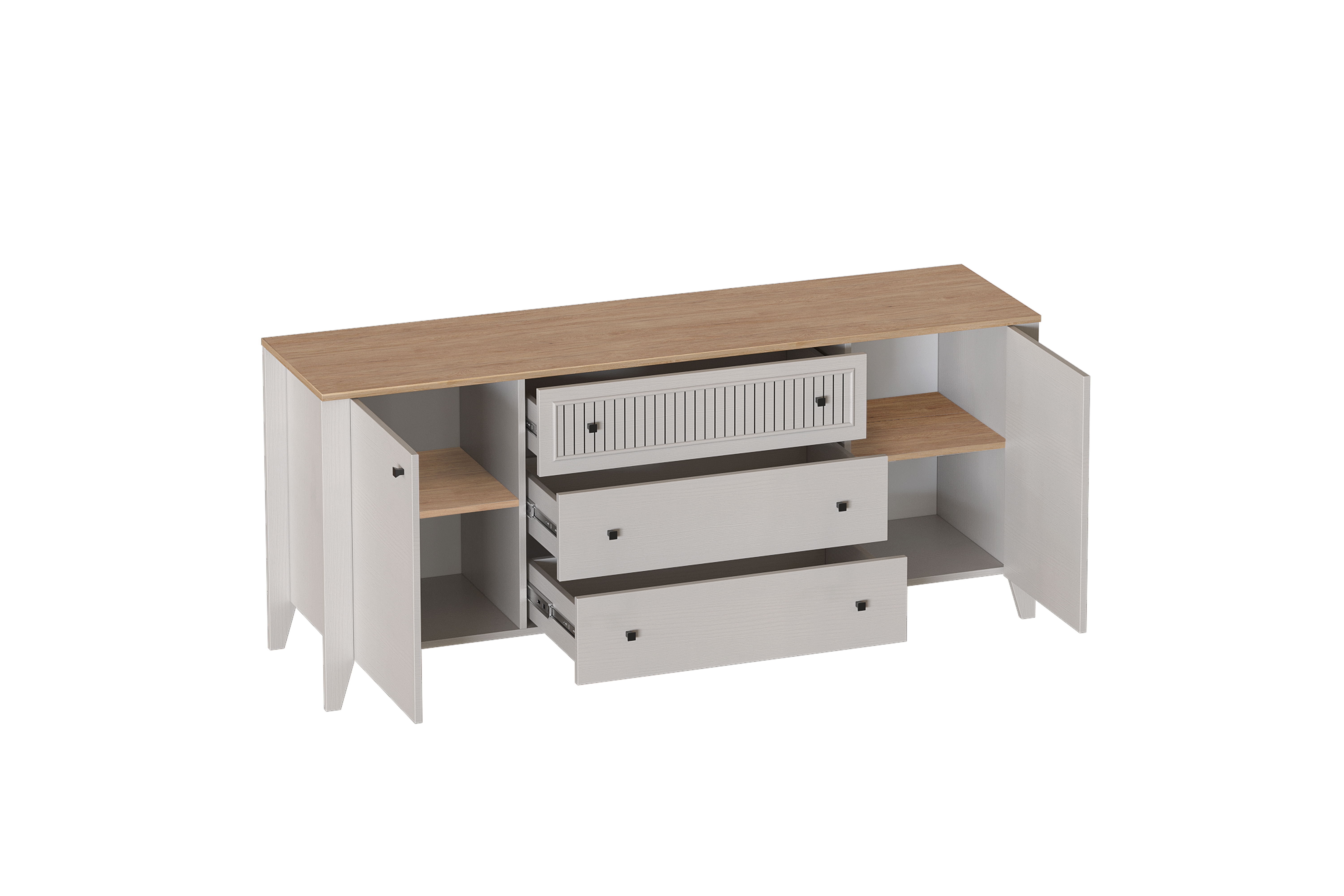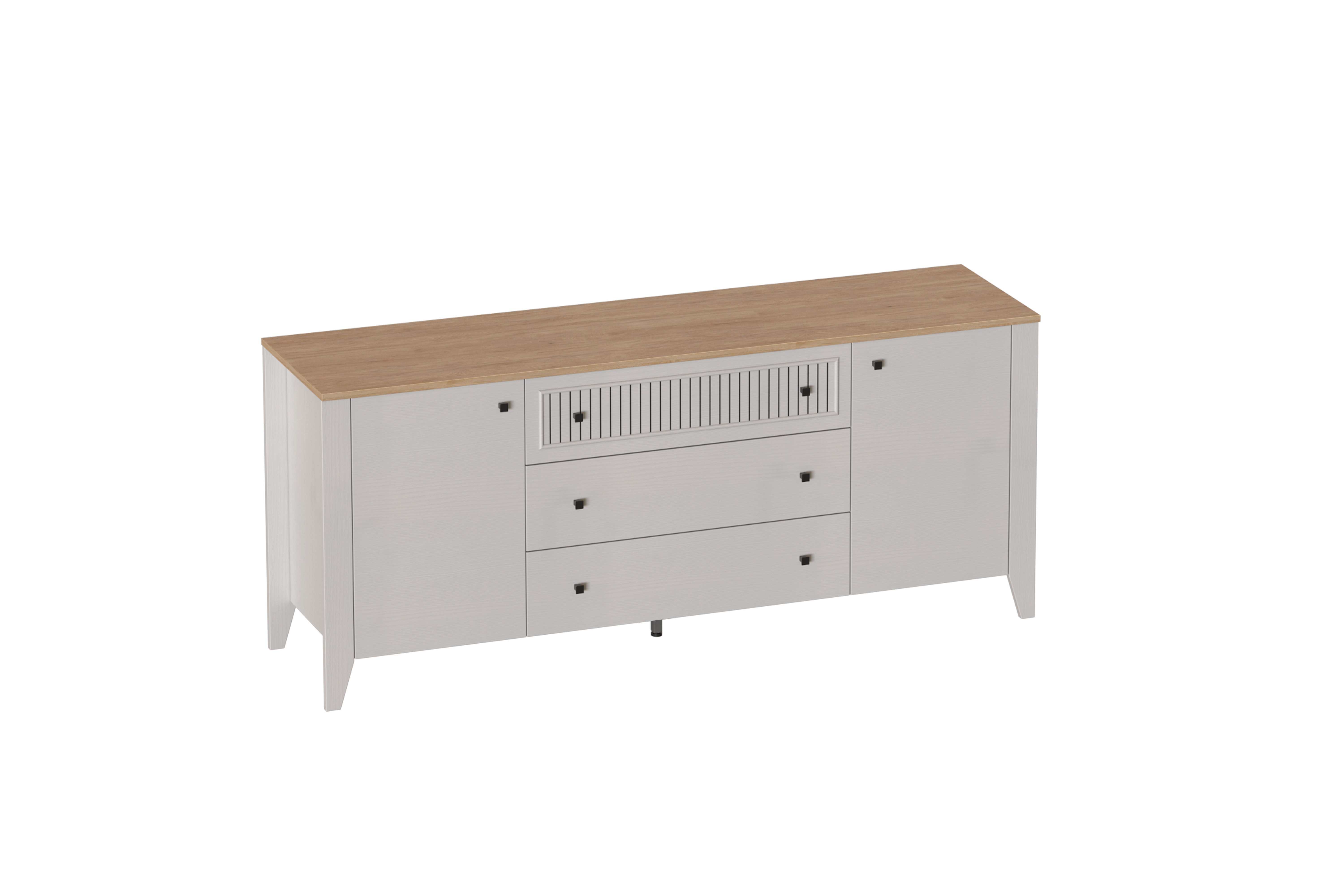 Тумба ТВ "Валенсия" выполнена в комбинации Дуб натуральный светлый / Персидский жемчуг и оснащена 3 ящиками на шариковых направляющих (без амортизаторов). Она выполнен из безопасных, качественных материалов, что гарантирует долговечность и сохранение первоначального вида на протяжении долгого времени.